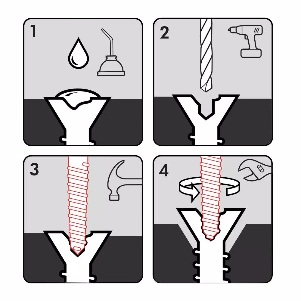 - Simply drill with drill bit, tap in extractor, and remove screw or bolt
