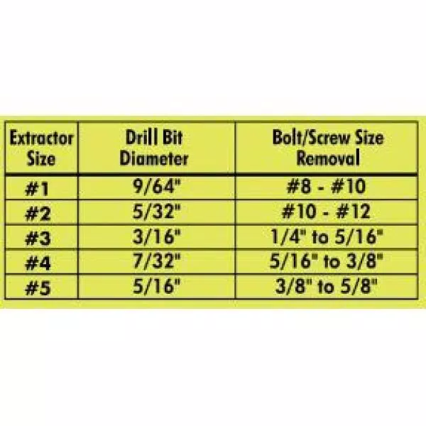 - Includes: (5) Black Oxide Threaded Steel Screw Extractors in 5/64 in., 7/64 in., 5/32 in., 1/4 in., and 19/64 in. sizes