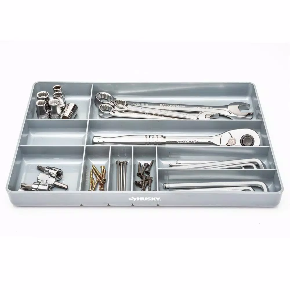 The Husky Universal Tray stores and organizes parts and tools to help you stay organized in your shop or garage. Specifically built to fit most tool box drawers (11 in. x 16 in.) and sturdily constructed of durable plastic, this organizer has 10-compartments of various sizes. These compartments hold wrenches, ratchets, sockets, nuts, bolts and other components needed to complete your task at hand.