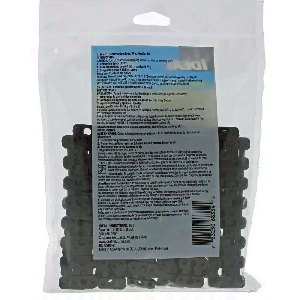 The Ideal Spacers are perfect for supporting loose outlets and preventing faceplates from being broken. These spacers help eliminate the need to cut plate screws for GFCI decorator devices when they are installed on tile and marble and can also be used as shims. Tear apart Spacers caterpillar together to create desired shim depth.
