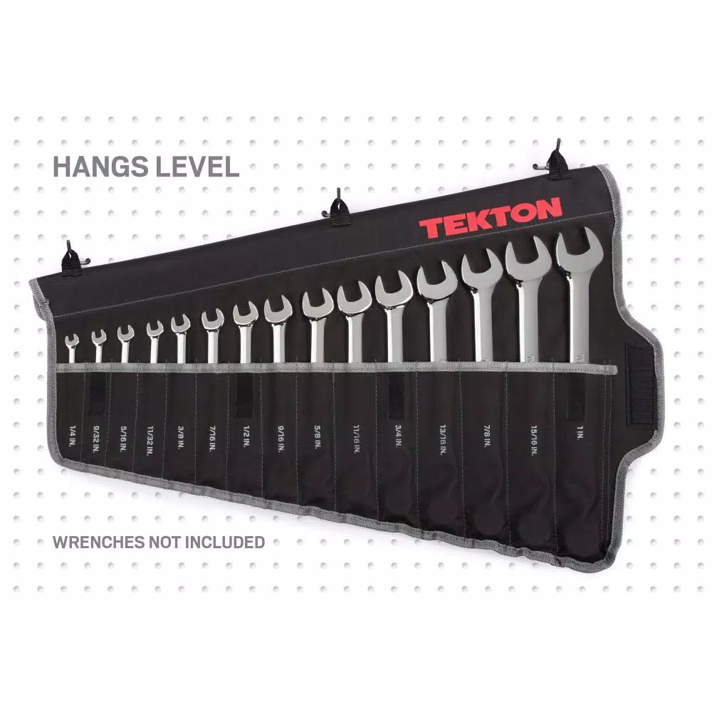 Carry your combination wrenches anywhere in a roll-up pouch that keeps them neatly organized in individual pockets and secured under a tailored cover that prevents them from sliding out the end. Sewn-on hanging loops allow the pouch to be suspended from tool hooks. Clear printed size markings ensure youβre never stuck searching for the right wrench.